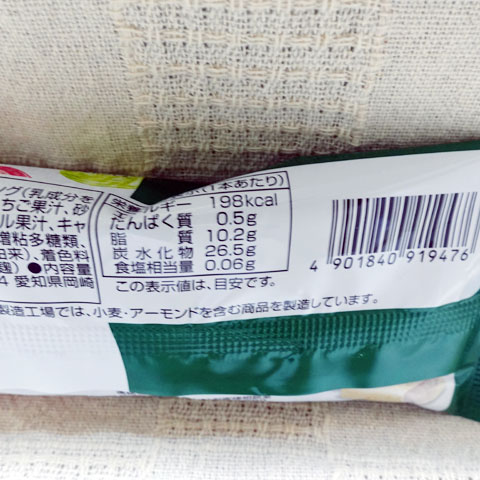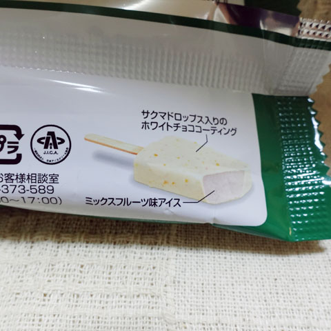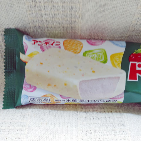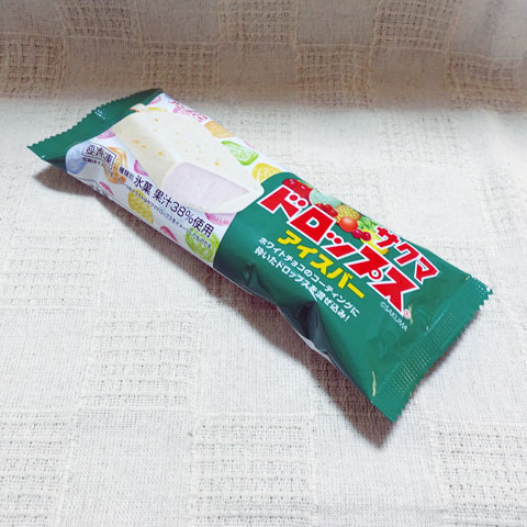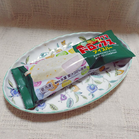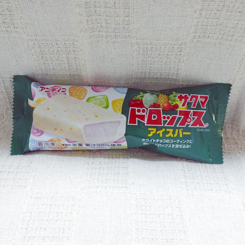 淡いピンク色のミックスフルーツ味のアイスがあり、それを、砕いた7種類のサクマドロップスを混ぜ込んだホワイトチョコレートでコーティングしてある、バータイプのアイスです。