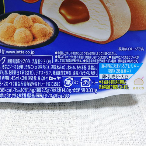 きなこアイスがあり、その中に深煎りきなこソースを配置し、それらを茶色のきなこもちで包みこんである、大福のような形をしたアイスが一箱に2個入れられてあります。
